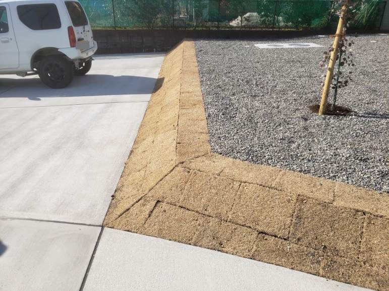 法面の芝は法肩に一枚分貼る事で雨が降っても土や砂利が駐車場部分に流れ出す事はありません。