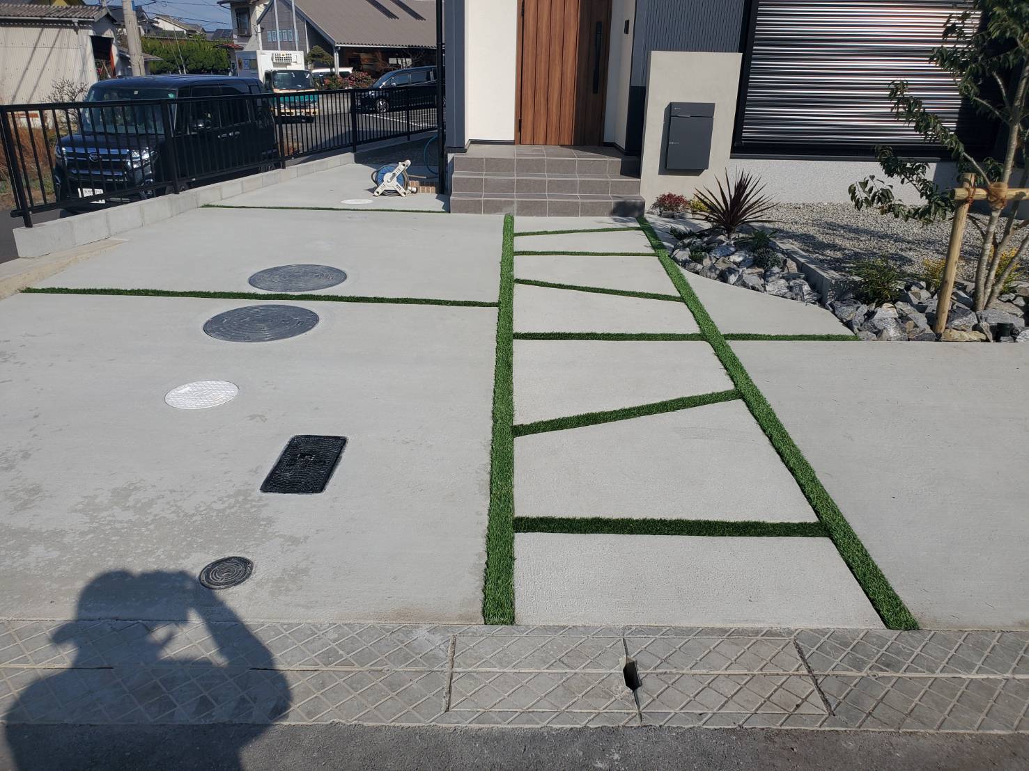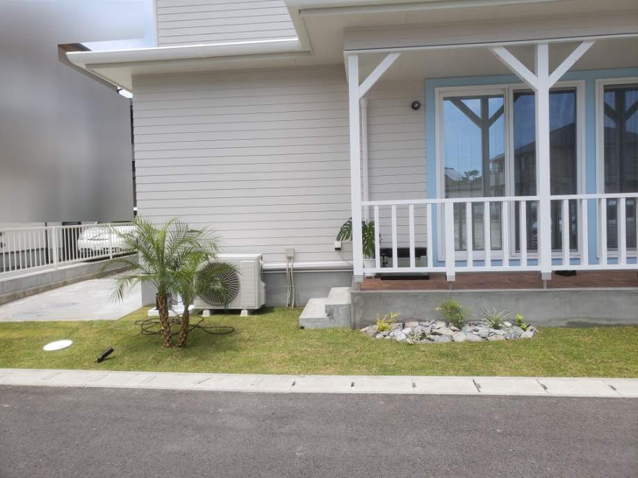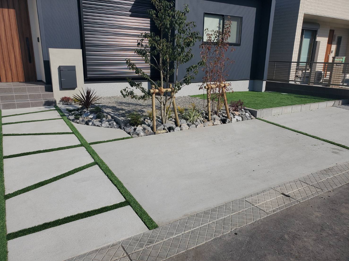 駐車スペースの目地を人工芝にする事で華やかな雰囲気に仕上がりました。
