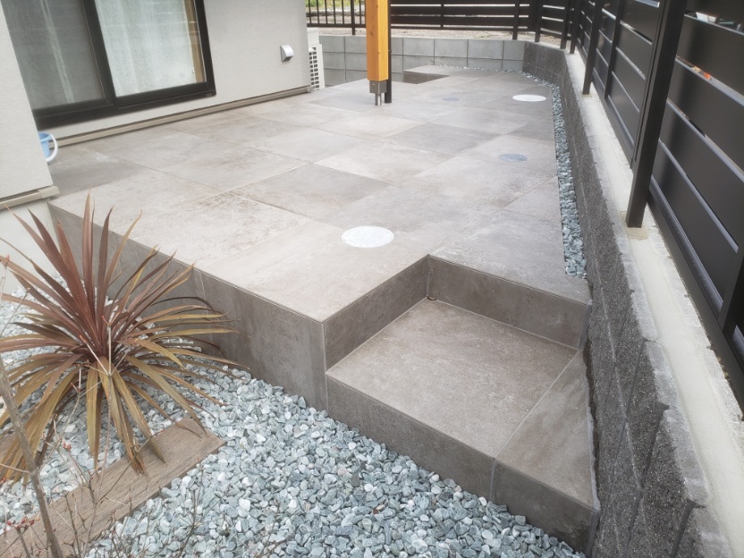 防草シート、宝満砂利、床材にはTOYOサルトペイブ300×600を施工。