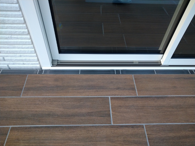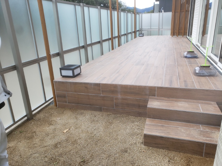 立水栓を囲むように、お施主様のご希望で低いタイルテラスを施工しました。