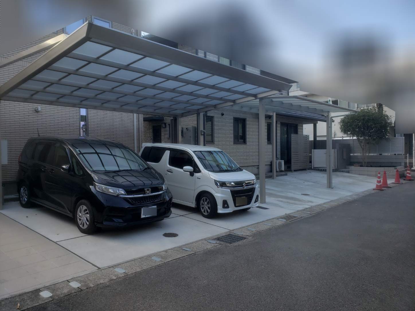 ご子息様邸のカーポート(写真手前)は「四国化成:マイポートNextワイドタイプ」
