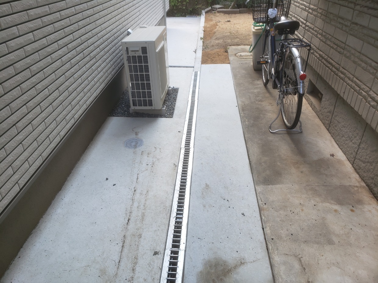 両家の境界部の水はけに側溝とグレーチングを施工しました。